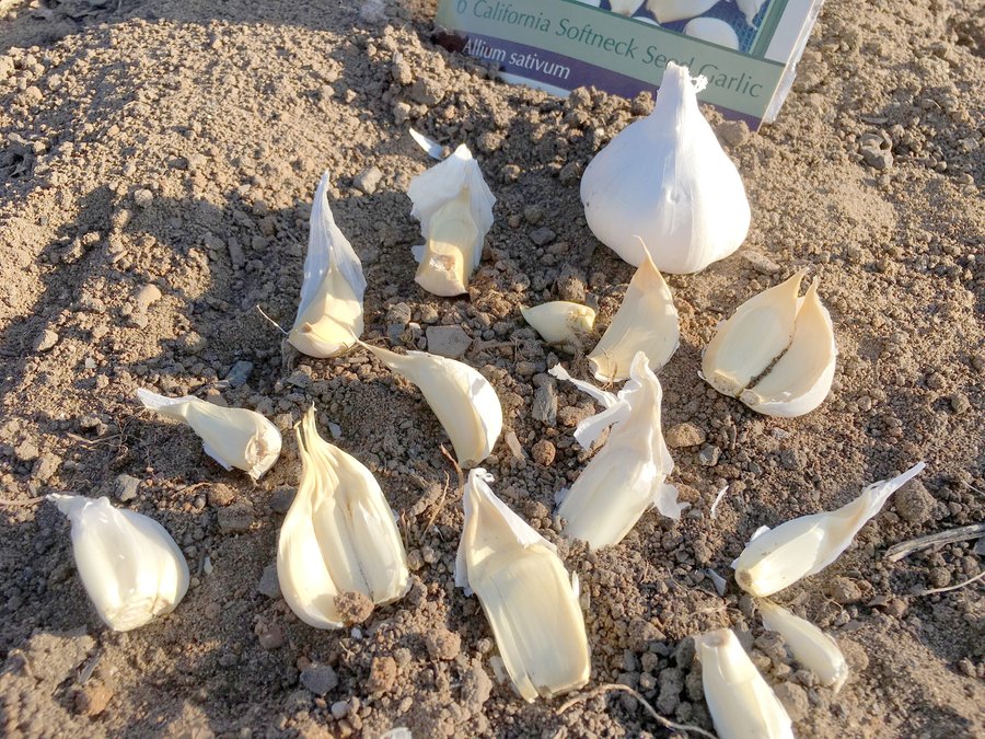 Plant the cloves in the fall about six weeks before the ground freezes in cold climates and late fall or early winter in warmer regions. Space individual cloves six inches apart with the pointed side up and the base of the clove two to three inches below the soil surface. Space single rows 12 to 14 inches apart or double rows six inches apart with 30 inches between each set of double rows. For more intensive wide row and square foot growing, plant multiple rows with four to eight inches between cloves.