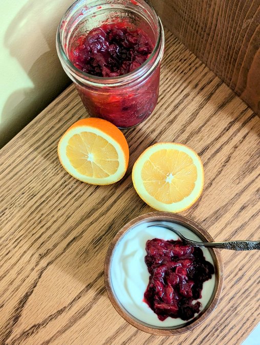 Zest orange into a saucepan; then peel it, separate into wedges and dice, and add to pan along with remaining ingredients. Bring to a simmer and cook for about 10 minutes, until all the cranberries have popped. Cool, and serve as desired…which should be in a bowl of yogurt.