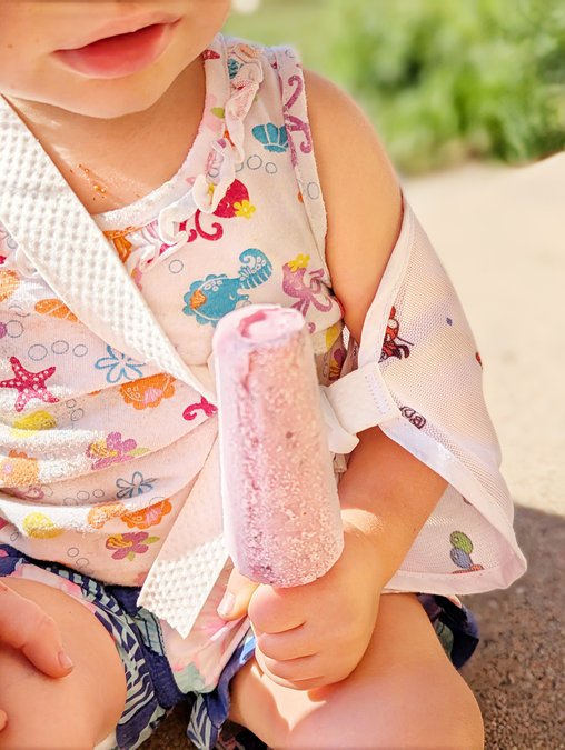 But no, Ki immediately pointed straight to the only storebought popsicle we have. To my knowledge, she has never had a “real” popsicle at our house. I have no idea how she even knew it was in there, not to mention that now was the exactly right time to ask for it. Any other day, I would have told her no, we were saving it for a special reward, but somehow she knew today I would give her mostly whatever she wanted. Girl, your arm is broken, have The Mango Popsicle.